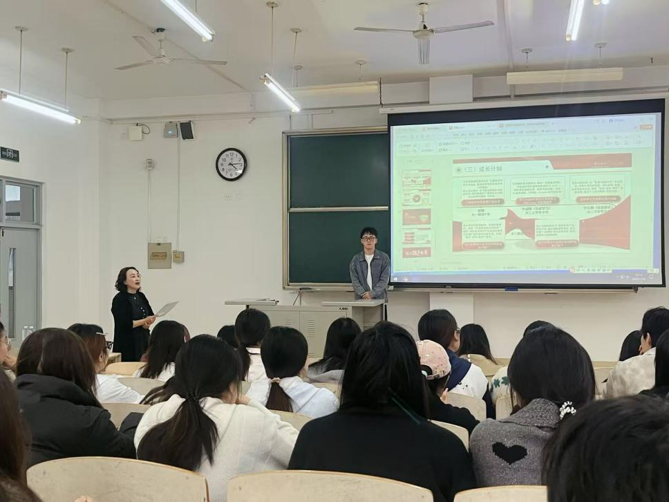 围绕着同学们在职业规划和备赛过程中的核心困惑,洪芳展开详细讲解。一方面,针对职业规划,从“找准职业目标、规划成长方向与路径、做好个人生涯规划、提升职场核心能力”等要点切入,引导大家结合所学专业、行业发展趋势和自身优势确定方向,提倡通过参与社会实践等多种方式积累资源,鼓励同学们以本次赛事为契机,科学规划职业生涯;另一方面,针对备赛,洪芳为两位同学提供了一对一指导,结合实际情况给出针对性建议,助力同学们进一步完善备赛方案。她对照往届赛事,拆解赛事全环节流程节点,提炼核心任务,明确职业规划书、PPT等材料的具体标准,重点分享生涯发展报告的撰写技巧,从结构搭建到内容填充,都提供了诸多实用且具创新性的建议。她还通过生动的案例,系统地指导学生如何进行科学的自我认知、职业探索与目标设定,鼓励学生将个人职业规划与时代需求和国家发展结合起来,既怀抱梦想又脚踏实地,既敢想敢为又善作善成,踔厉奋发,勇毅前行,绘制出属于自己精彩的人生蓝图。