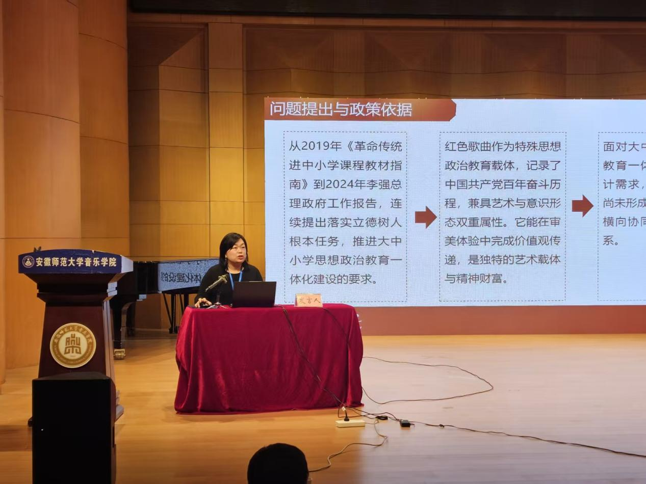在分论坛研讨环节,相九芮以《中国近现代红色歌曲融入大中小学思政教育一体化普及的必要性与策略研究》为题,提出以红色歌曲为抓手融入大中小学思政教育中,以青少年不同年龄段心理接受度与认知度为基础进行分层梳理,进行一体化红色歌曲普及教材,夯实美育+德育协同育人。