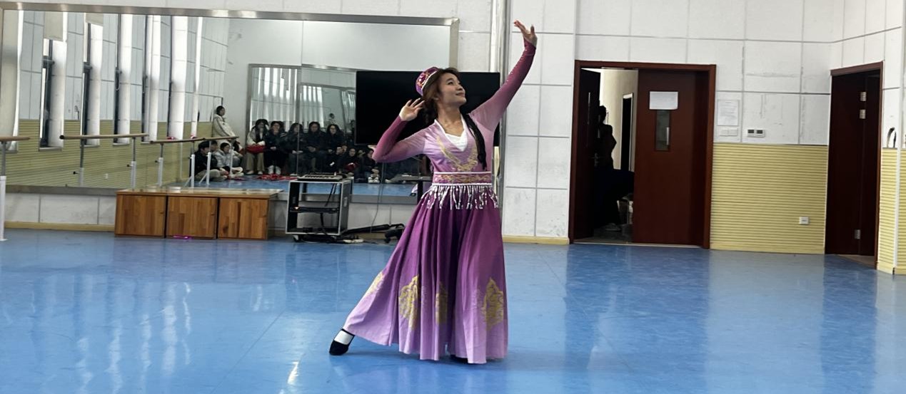 在随后的自选作品展示部分,同学们以小组形式展现了多元的舞蹈风貌。《新娃哈哈》在熟悉的旋律中注入童趣编创,李盈佳同学身着维吾尔舞蹈服饰,演绎清新活泼。