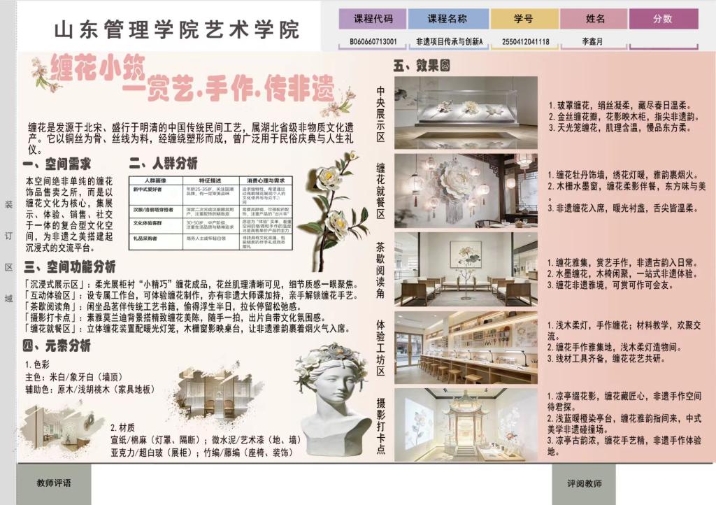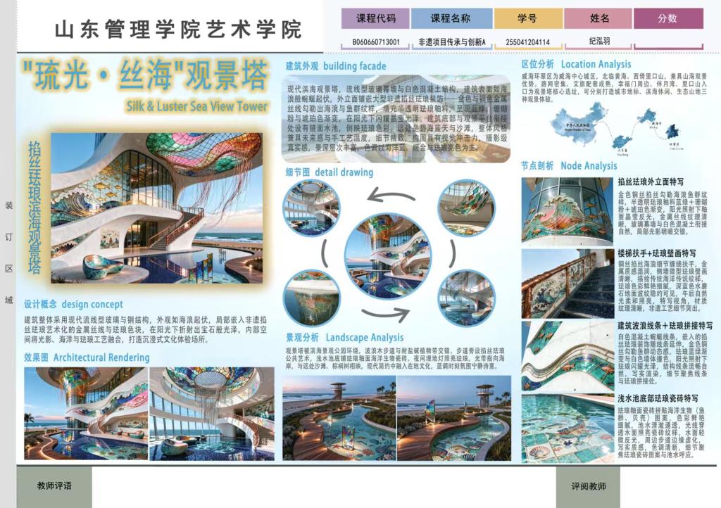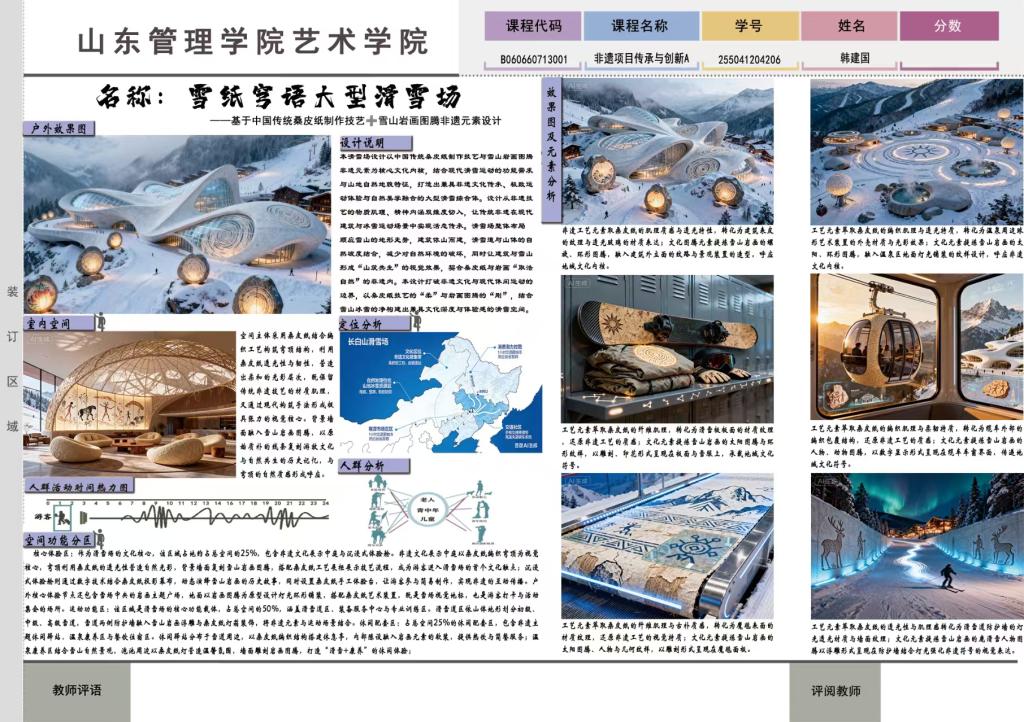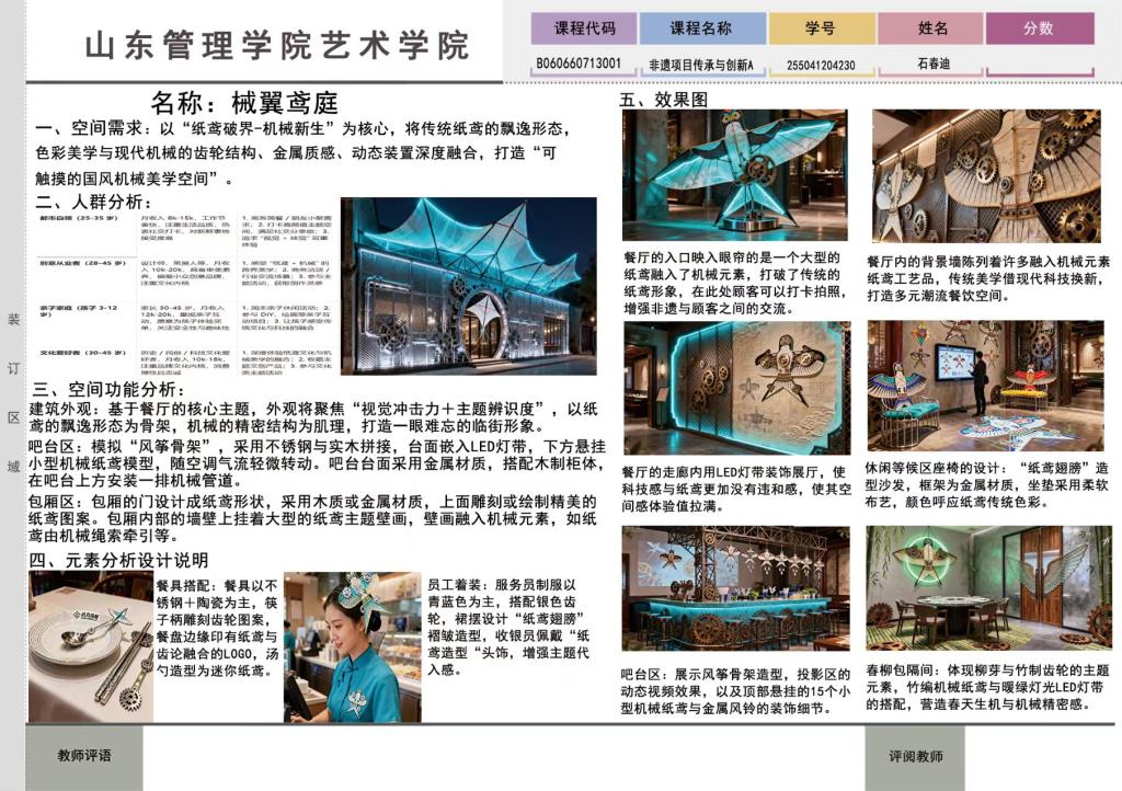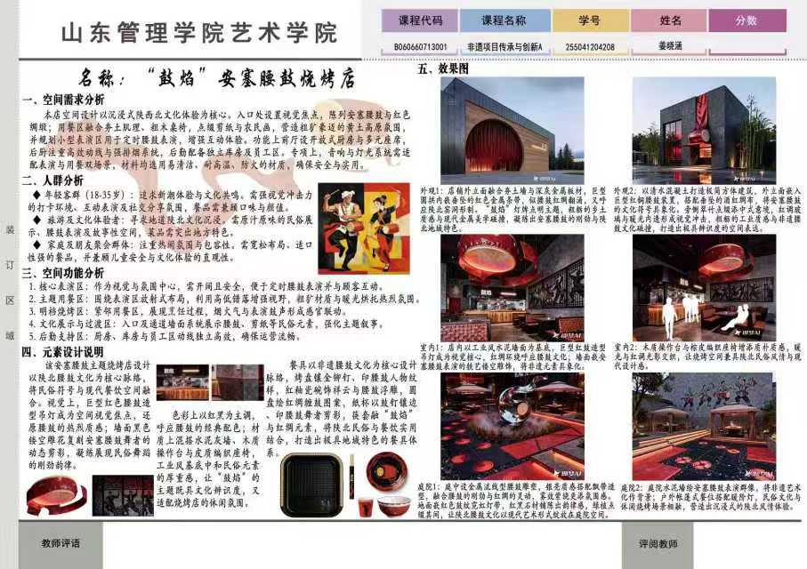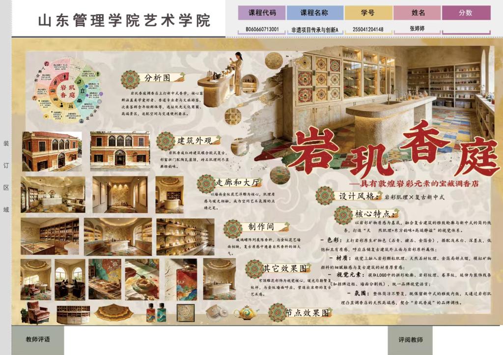 环境设计专升本专业所开设的“非遗项目传承与创新A”课程,紧紧围绕“传统非遗技艺+现代设计创新”这一核心,构建起“认知—实践—创新—应用”的教学逻辑链条,引领学生深度探寻非遗文化的深厚内涵,积极探索其在当代设计语境下的创新表达路径。课程中实地观摩传统技艺以及开展实践调研等一系列活动,全方位、沉浸式地深入了解剪纸、扎染、篆刻、竹编、岩彩等众多传统非遗项目所蕴含的艺术精髓。在李云飞老师的指导下,25级环境设计专升本同学充分发挥现代设计思维的创造力,巧妙运用AI工具,对非遗元素进行大胆解构与巧妙重构。他们以独特的视角和创新的手法,将传统元素与现代设计理念完美融合,创作出一系列既保留传统韵味又契合当代审美的设计作品。