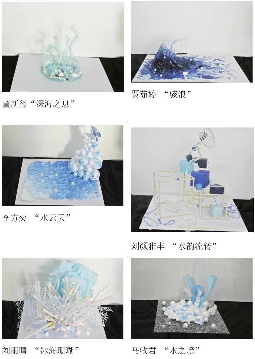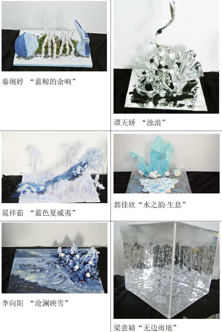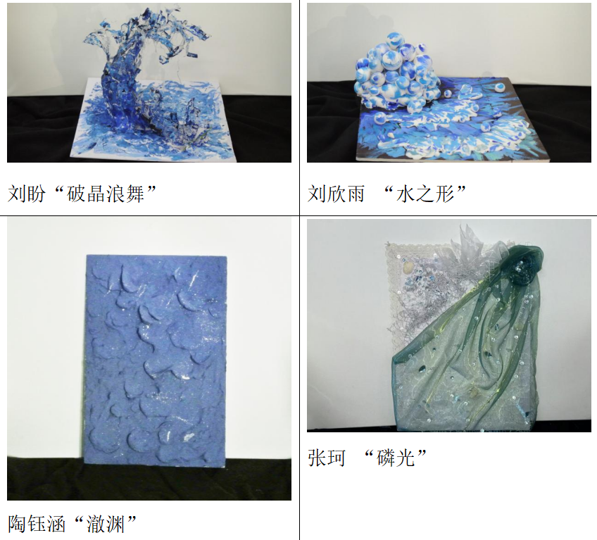 在任课教师曹雨的悉心指导下,本次设计实践围绕“水”的灵动主题展开。结合造型艺术学,学生们从绘画中捕捉水波的灵动色彩,于装置艺术里感受水元素的多元形态,在雕塑中领悟水与材质碰撞出的独特质感,不断探寻色彩与造型融合的无限可能。