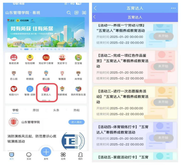 1.学生通过易班APP“五育达人”板块参与各项活动(具体如下图,注:所有提交的视频形式作品不超过500M)。