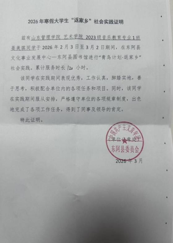为引导同学们在实践中深学细悟习近平新时代中国特色社会主义思想,深入学习领会党的二十大和二十届历次全会精神,感受中国式现代化的万千气象,引导学生树牢理想信念、认识国情民情,激发投身基层、服务家乡的家国情怀和责任担当,艺术学院响应学校号召,按照学校团委有关通知要求,积极组织开展 2026 寒假“返家乡”社会实践活动,艺苑学子踊跃参与,怀揣热忱投身基层,在实践中锤炼本领、践行青春担当。