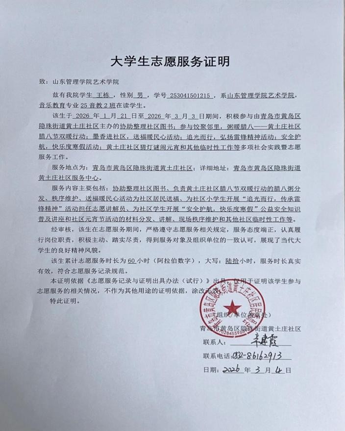 2025级音乐教育专业2班王栋在青岛黄土庄社区,为结合所学小学生开展雷锋精神宣讲和寒假安全知识普及志愿服务,以实践践行志愿精神,锤炼了意志品质。