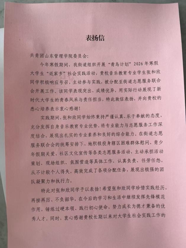 2025级音乐教育专业的张和欣积极参加“青鸟计划”,投身东营街道志愿服务,融合音乐教育专业优势,参与困难群体慰问、社区文化宣传等工作,牵头活动策划组织,表现突出获街道团委致信表扬。