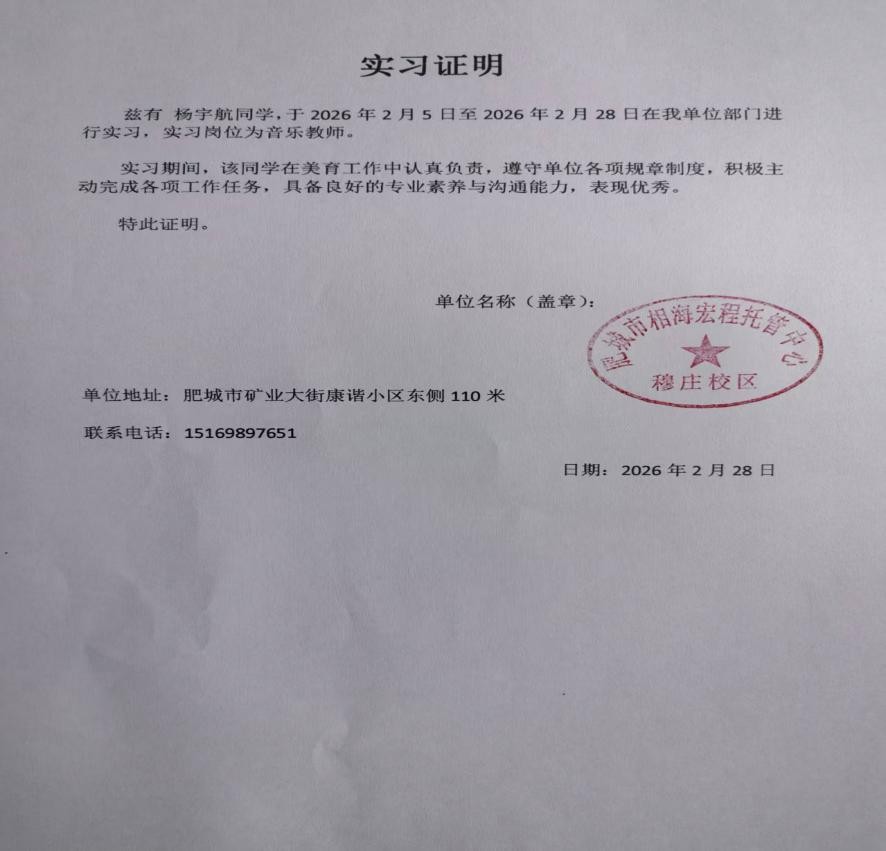 2024 级音教专业2班杨宇航在肥城市为相海宏程留守儿童开展了14 天的音乐教学志愿服务,期间结合当地留守儿童的兴趣爱好,讲解音乐知识,将专业知识与社会需求结合,锤炼综合能力,为公益事业贡献青春力量。